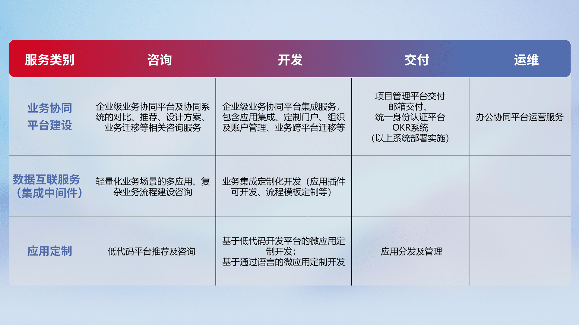 针对钉钉、、企微、、IDaas等平台级产品提供产品的规划、、方案、、、、交付、、、定制化开发等服务,,,实现如统一协同办公、、智能客户服务、、混合会议管理、、智能数据查询、、等业务场景,,,实现数字化转型。。。。