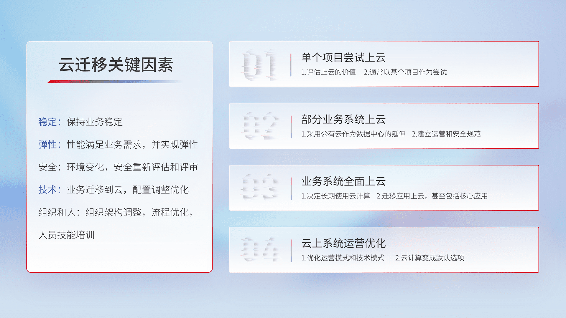 结合实际业务,,从规划设计、、云平台选型、、云原生改造、、、、数据迁移、、、、集成交付,,迁移全过程为客户识别最佳上云路径,,做好风险识别管理,,,,设计网络架构、、、身份权限、、、安全审计合规、、操作审计、、、、日志审计、、、监控告警策略、、、多站点容灾设计等,,,,对云上基础设施进行整体规划,,,提升IT治理水平,,,以满足弹性、、、高可用、、、高性能的需求。。。。
