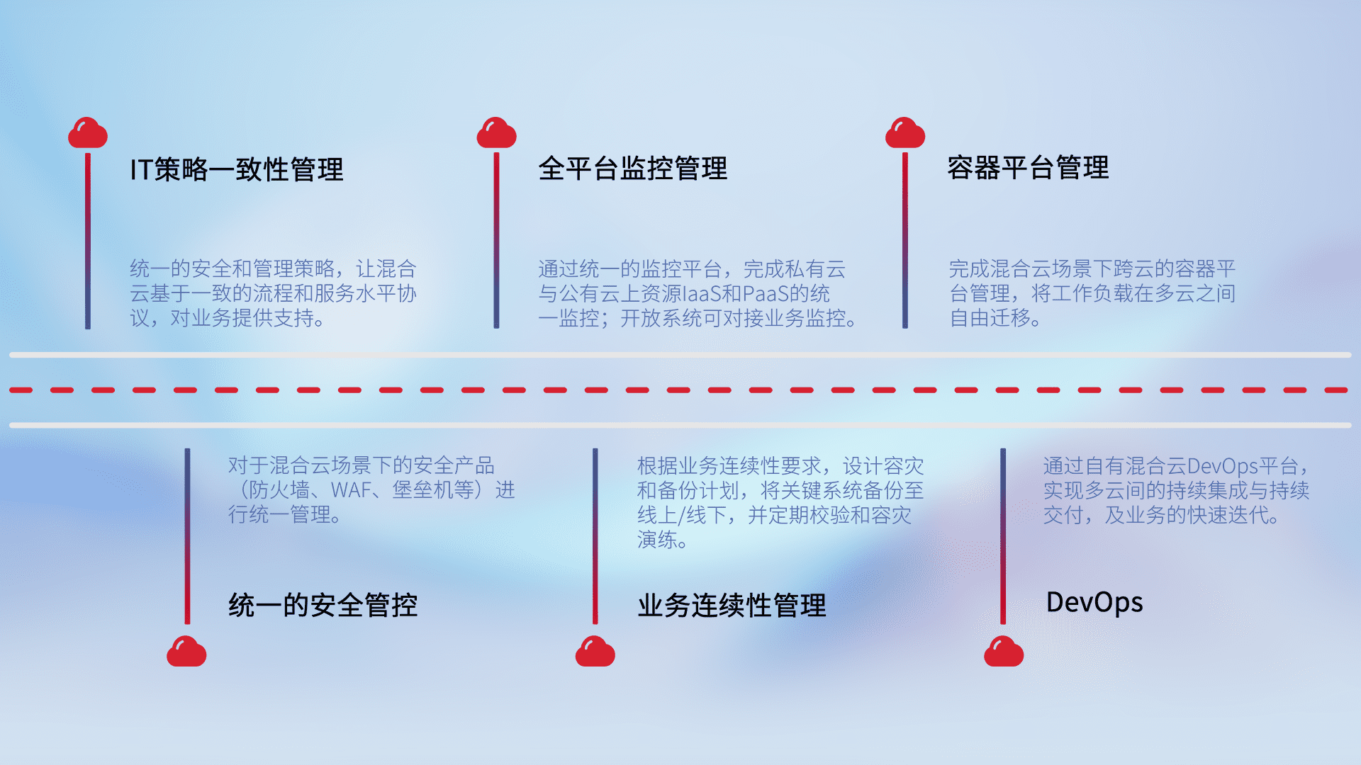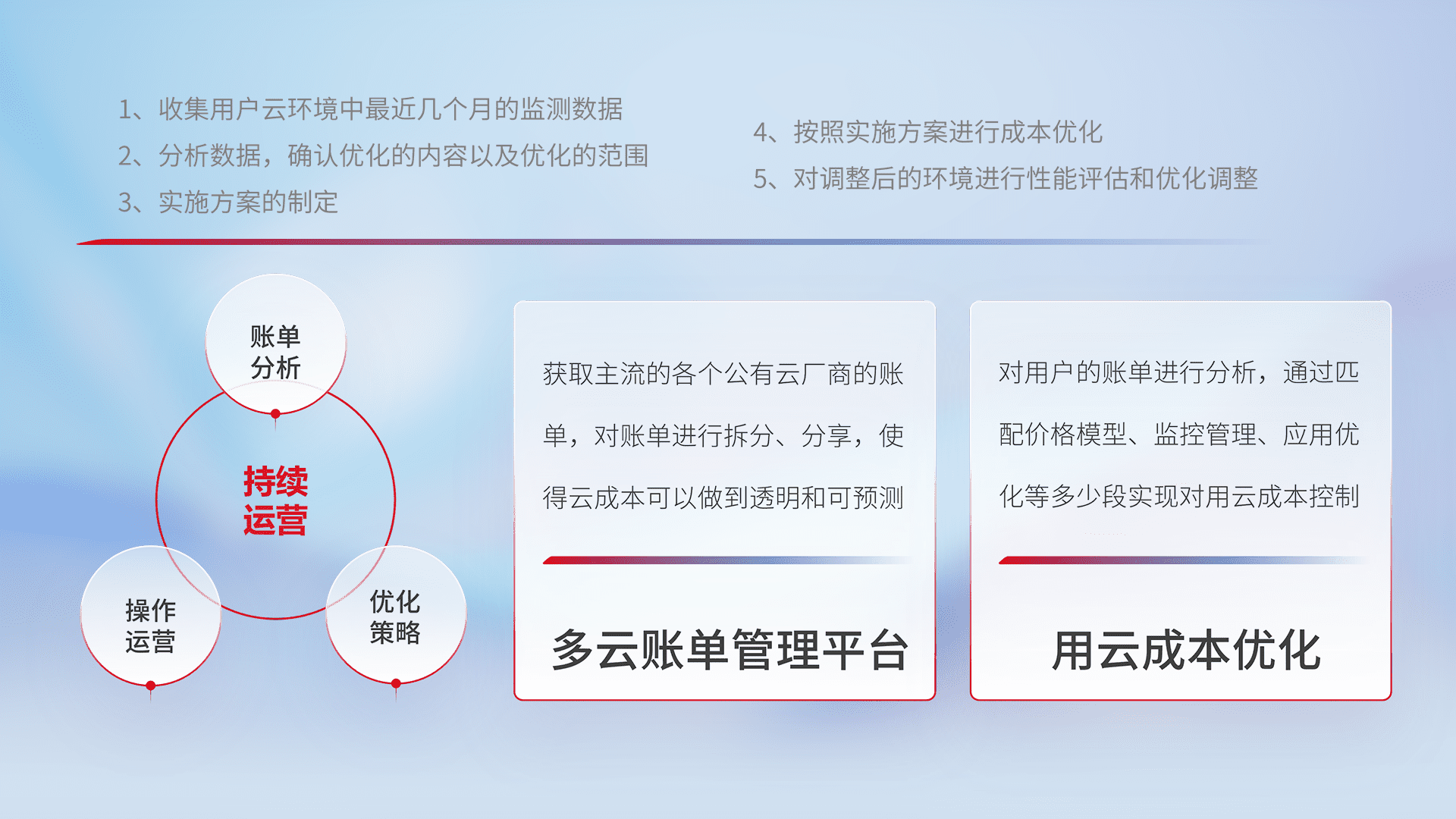 通过多云纳管,,,以统一的资源数据模型把客户的云资源进行抽象和封装,,,进而实现对多云资源的统一操作,,,保障云资源管理的可靠性、、稳定性与可用性。。。。量身定制化运维内容,,配置、、、、开发运维、、、、补丁管理、、备份、、监控、、、、认证和访问管理、、、审计和日常巡检等,,,,保障在用云过程中的可靠度,,,稳定度以及高可用率。。